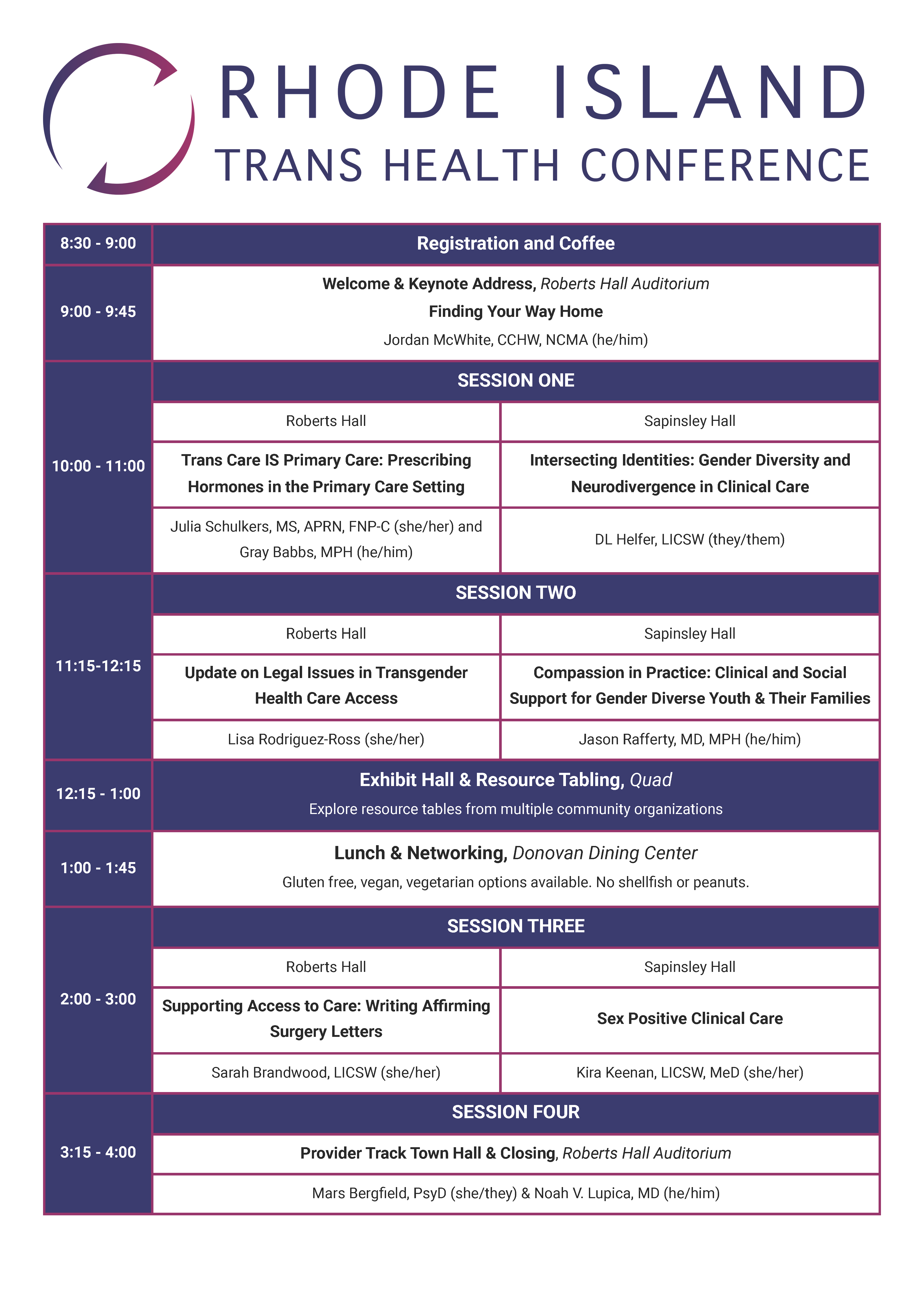 This is the 9th Rhode Island Trans Health Conference dedicated to enhancing the health and well-being of the transgender and gender diverse (TGD) community. The conference will provide interactive, evidence-based learning for interdisciplinary professionals across the care continuum to increase confidence in providing quality care for all TGD individuals. In addition to didactic presentations, attendees will have opportunities to learn from practitioners with lived experience and expertise in TGD health and wellness. Running concurrently to the Provider Track, the Community Track will hold space for the TGD community and their families to learn about available resources and build affirming space to intentionally connect, learn, and embrace joy.